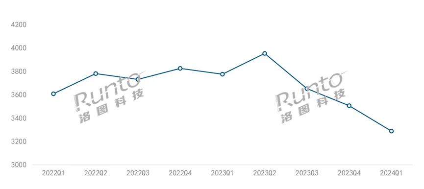 DLP市場價格方面,2023年第二季度之前,DLP產(chǎn)品在光源(激光)、分辨率(4K)等方向上持續(xù)提升,均價呈現(xiàn)波動性上漲;之后,受1LCD產(chǎn)品快速成長的影響,芯片供應(yīng)商德州儀器(TI)將其0.23英寸方案價格降低一半,隨即終端產(chǎn)品的價格開始步入下行通道。2024年第一季度,DLP產(chǎn)品在線上市場的均價為3289元,較2023年同期下降了近500元。