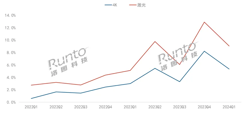 2022-2024年 中國智能投影線上市場4K和激光滲透率