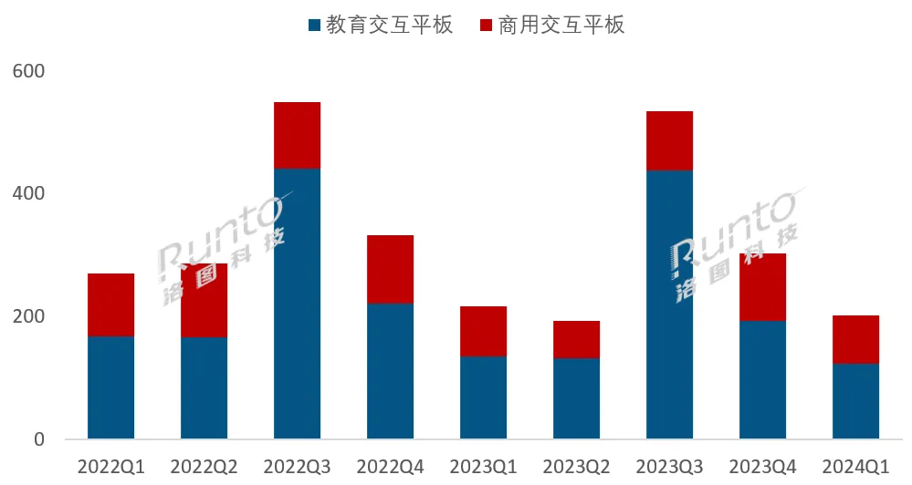 從行業(yè)應(yīng)用結(jié)構(gòu)看,政務(wù)部門的應(yīng)用比重依然是最大,出貨面積的占比為27%;教育行業(yè)在2024年第一季同環(huán)比大幅增長(zhǎng),分別達(dá)8.4和4.5個(gè)百分點(diǎn),出貨面積的占比為22.1%。