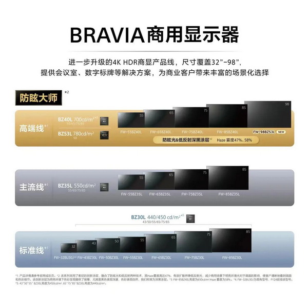 如今,經(jīng)過迭代更新后的索尼BRAVIA商用顯示器具備豐富的產(chǎn)品線陣容,包括高端線、主流線和標(biāo)準(zhǔn)線三條產(chǎn)品線,覆蓋32至98英寸機型,亮度覆蓋多種選擇,最高可達780nit,并搭載XR/X1芯片,可服務(wù)不同規(guī)模和用途的商用場景。