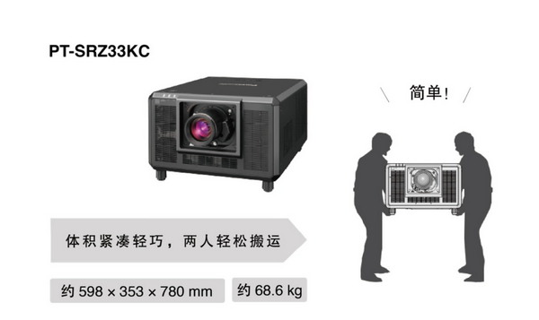 在同流明段的3DLP產(chǎn)品中,松下PT-SRZ33KC保持著輕重量和小體積的特點(diǎn)。整機(jī)68.6KG的重量,兩名成年人即可輕松搬運(yùn),釋放人力。小體積可適應(yīng)更多狹窄的安裝空間,有效提高運(yùn)輸、安裝效率,降低成本。