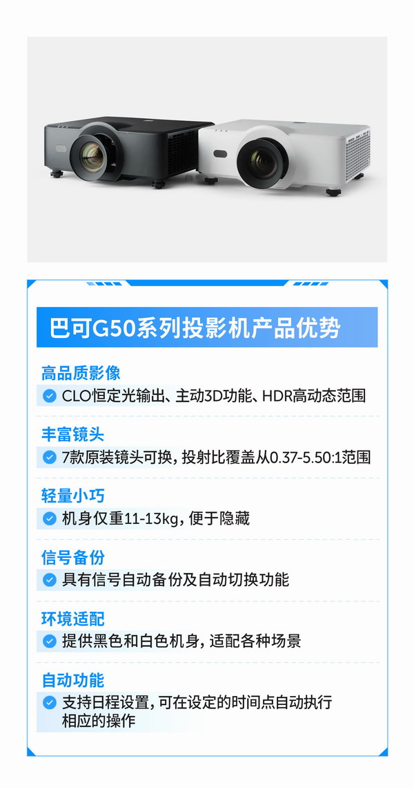 分辨率投影畫(huà)面在明亮的室內(nèi)環(huán)境中依然保持細(xì)膩清晰,色彩鮮艷。巴可G50系列投影機(jī)憑借靈活易用、緊湊輕巧的設(shè)計(jì),以及領(lǐng)先的