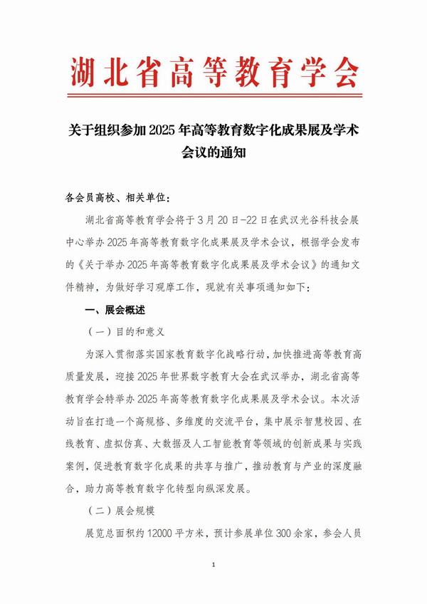 日前,湖北省高等教育學(xué)會(huì)下達(dá)《關(guān)于組織參加2025年高等教育數(shù)字化成果展及學(xué)術(shù)會(huì)議的通知》。