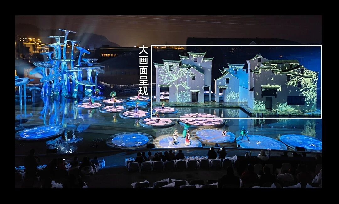 它與舞臺實(shí)景、演員、聲光電等配合,相較于傳統(tǒng)舞臺布景,投影畫面更具靈活性與視覺表現(xiàn)力,為舞臺演藝項(xiàng)目塑造出更為豐富的舞臺形式。
