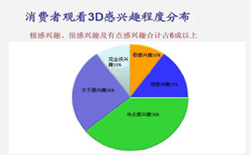 消費(fèi)者對(duì)3D的興趣程度,也能使我們對(duì)未來(lái)3D產(chǎn)業(yè)的發(fā)展保持樂(lè)觀。調(diào)查顯示,消費(fèi)者對(duì)觀看3D極感興趣、很感興趣及有點(diǎn)感興趣的合計(jì)超過(guò)六成。