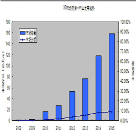 據(jù)調(diào)研機(jī)構(gòu)DisplaySearch最新顯示器市場(chǎng)與技術(shù)分析報(bào)告顯示,預(yù)計(jì)2018年立體3D顯示器市場(chǎng)將由2009年的70萬(wàn)臺(tái)增長(zhǎng)到1.96億臺(tái),產(chǎn)值將達(dá)到220億美元,出貨量年符合增長(zhǎng)率高達(dá)75%,而產(chǎn)業(yè)值的年復(fù)合增長(zhǎng)率為38%。