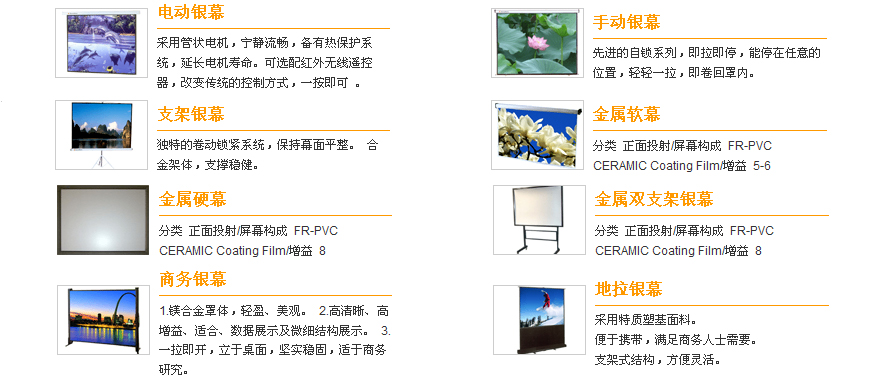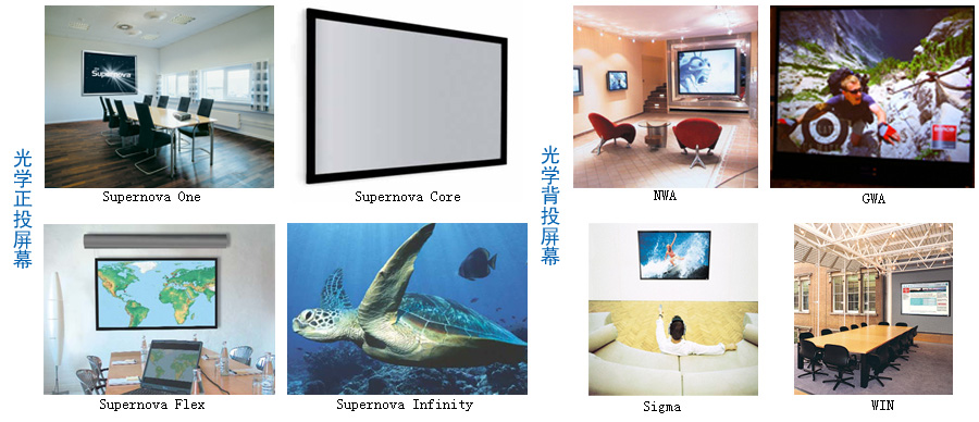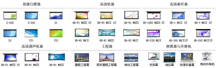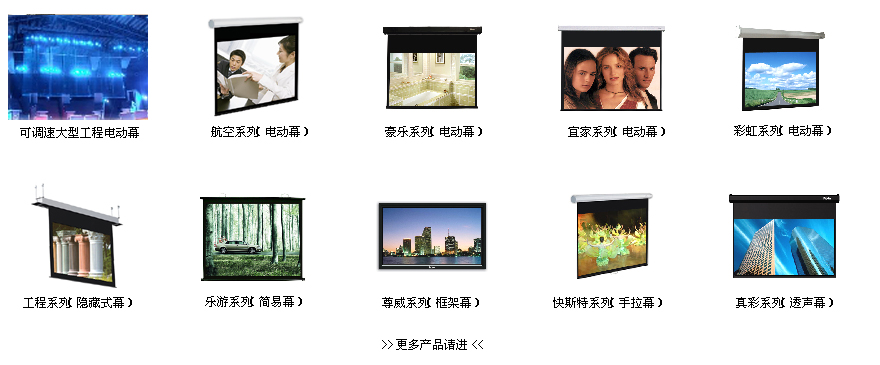 公司目前推出“影雪”、“鉆石”、“金剛”、“飛雪”“背投”五大系列投影銀幕,主要產(chǎn)品有:電子白板、投影機、豪華影院拉線幕、手動幕、交互式智能電動幕、支架幕、金屬幕、精品畫框幕、快速折疊幕、背投、反射鏡及支架等。