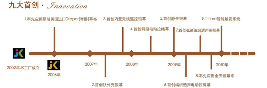 2002年在中國國內(nèi)投資開設(shè)“廣州經(jīng)科教學設(shè)備有限公司”生產(chǎn)銀幕,并有可能是國內(nèi)唯一家堅持采用原裝美國進口高清幕布的公司,產(chǎn)品涉及家用、商用、教育、影視等領(lǐng)域;這些產(chǎn)品不斷激發(fā)出強烈的感情和人們的渴望,鑄就了JK公司作為一家銀幕制造商的杰出聲譽;在中國是最知名的銀幕品牌之一,產(chǎn)品銷往全球幾十個國家和地區(qū)。