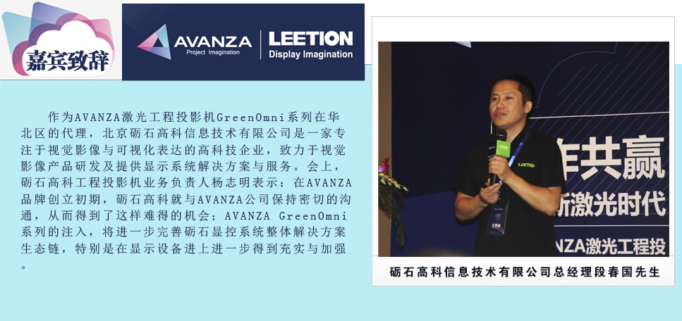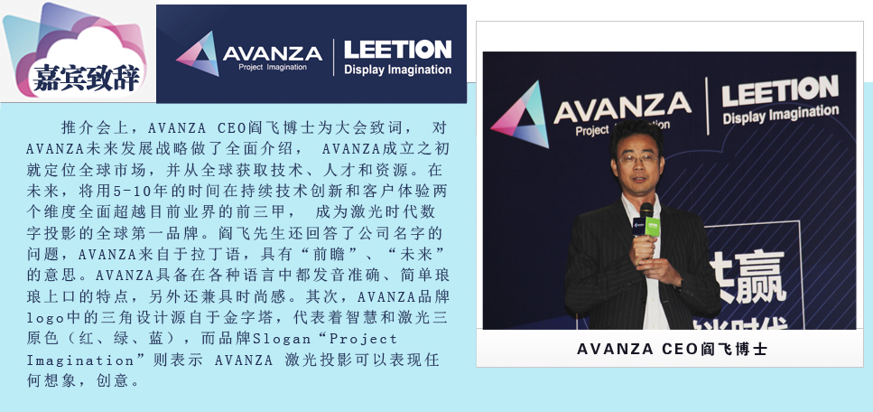 ![]() | 8月12日,以“合作共贏 引領(lǐng)新激光時(shí)代”為主題的AVANZA激光工程投影機(jī)2014年華北區(qū)渠道推介會在北京中關(guān)村皇冠大酒店隆重召開,會議吸引了來自全國的主流經(jīng)銷商/集成商前來目睹目前全球唯一量產(chǎn)的激光工程投影機(jī)系列、交流商機(jī),F(xiàn)場前后到場嘉賓五百多人,這在一個(gè)區(qū)域渠會上是前所未見的。AVANZA攜手北京礪石高科信息技術(shù)有限公司在推介會現(xiàn)場搭建了多套系統(tǒng)解決方案,涉及雙機(jī)融合大屏顯示方案、3D融合顯示方案以及云投影解決方案,通過產(chǎn)品講解、案例展示、應(yīng)用體驗(yàn)等方式,讓現(xiàn)場來賓全方位的體驗(yàn)AVANZA激光投影機(jī)無與倫比的卓越性能及前瞻性的應(yīng)用方案。 |