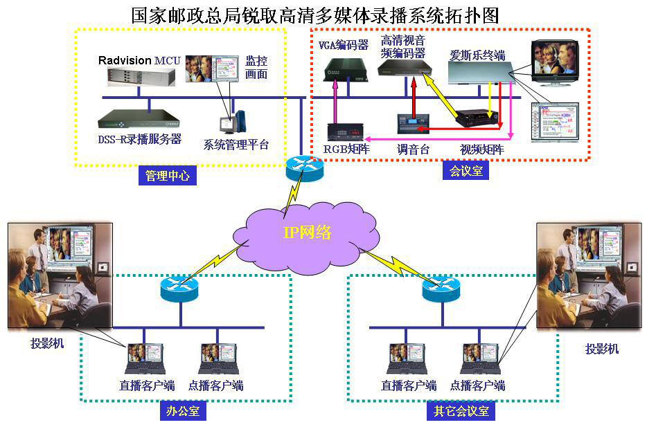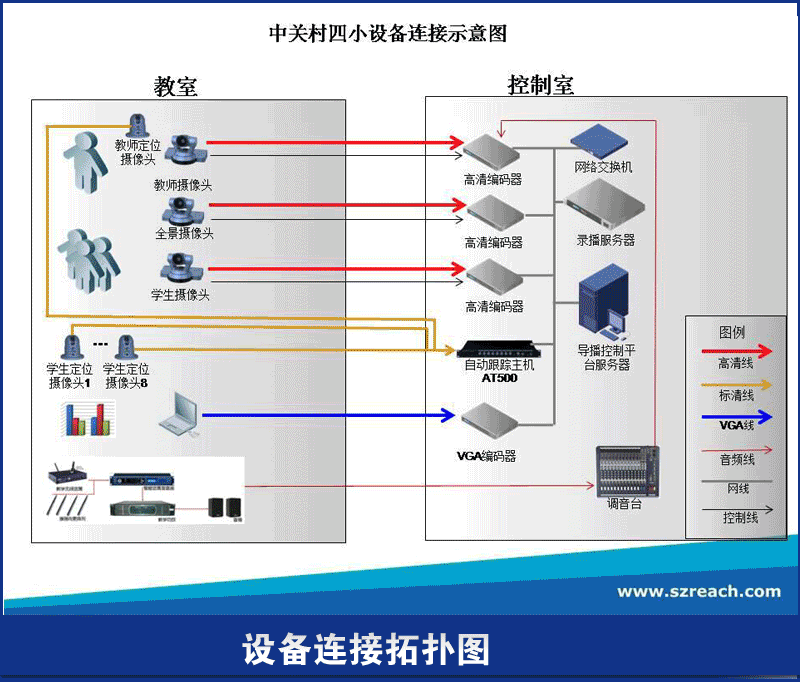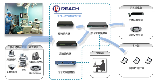 本套方案采用了以銳取分布式手術(shù)示教系統(tǒng)為核心的一系列產(chǎn)品來(lái)實(shí)現(xiàn)的。整個(gè)系統(tǒng)包含手術(shù)室端、觀(guān)摩室接收端、管理端以及客戶(hù)端組成。