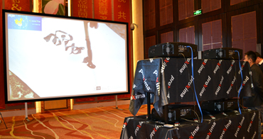 ![]() 巨幕光波多點(diǎn)觸控顯示平臺(tái)采用工作站式計(jì)算機(jī)系統(tǒng),結(jié)合業(yè)界觸控規(guī)格中的最高支持48點(diǎn)的可撓式光波多點(diǎn)互動(dòng)技術(shù),搭配表面以斜紋鋸齒涂層技術(shù)的背投式太陽膜,作為顯示屏,再通過多臺(tái)Proxima無燈泡LED超短焦投影機(jī)配合硬件式高階融合系統(tǒng),做無縫拼接融合,達(dá)到大家現(xiàn)在看到的4米*1.5米的互動(dòng)大畫面。