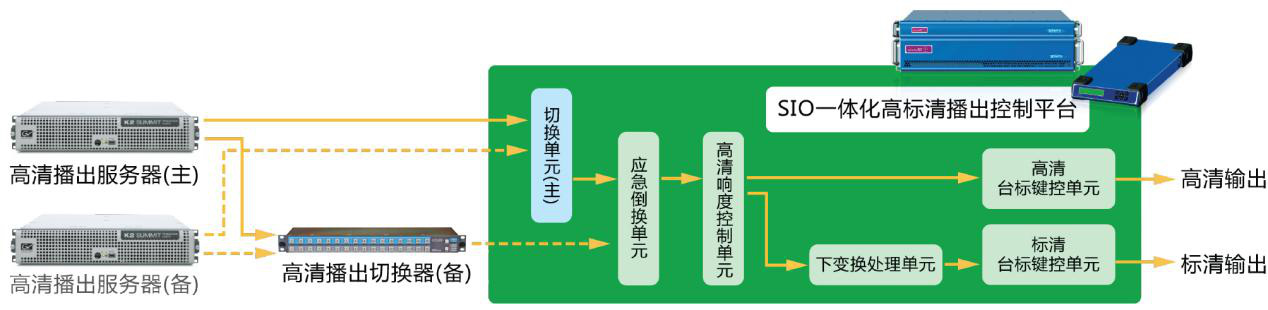 SIO一體化高標(biāo)清播出控制平臺采用高集成度的設(shè)計理念,將切換、臺標(biāo)鍵控、響度控制、下變換、應(yīng)急切換等多種功能合而為一, 通過一臺設(shè)備取代傳統(tǒng)的多個獨(dú)立的周邊設(shè)備,實現(xiàn)了高標(biāo)清播出系統(tǒng)的高度集成化、智能化的創(chuàng)新變革,簡化系統(tǒng)組成,實現(xiàn)快速部署的同時有效降低建設(shè)成本。