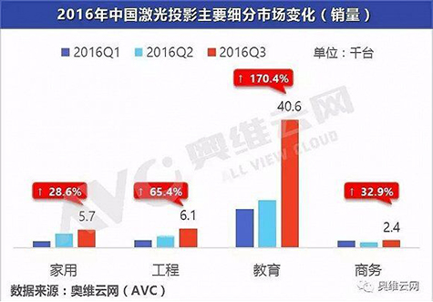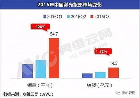 2016年,家用投影行業(yè)可謂是風(fēng)起云涌,在投影機技術(shù)方面實現(xiàn)了全面創(chuàng)新,新光源,新顯示技術(shù)的層出不窮,引領(lǐng)著行業(yè)不斷前行,可以說2016是激光年,引領(lǐng)4K時代開始全面爆發(fā)。而這些技術(shù)的進步與創(chuàng)新,將家用投影市場推向了一個新的高潮。 據(jù)不完全統(tǒng)計2016年前三季度,中國投影機市場營業(yè)規(guī)模預(yù)計維持110億元量級。其中,家用投影機市場銷量較同期實現(xiàn)增長,由于智能微投的進入和大力度推廣,已經(jīng)增幅達200%以上,成為投影機領(lǐng)域增長最快的市場。 |
