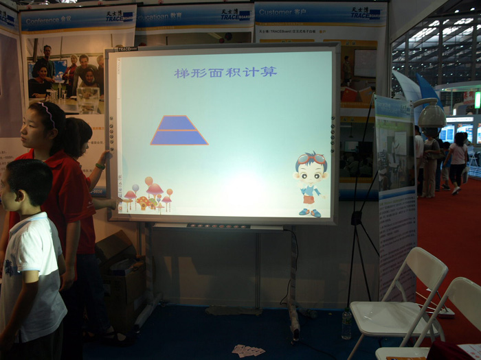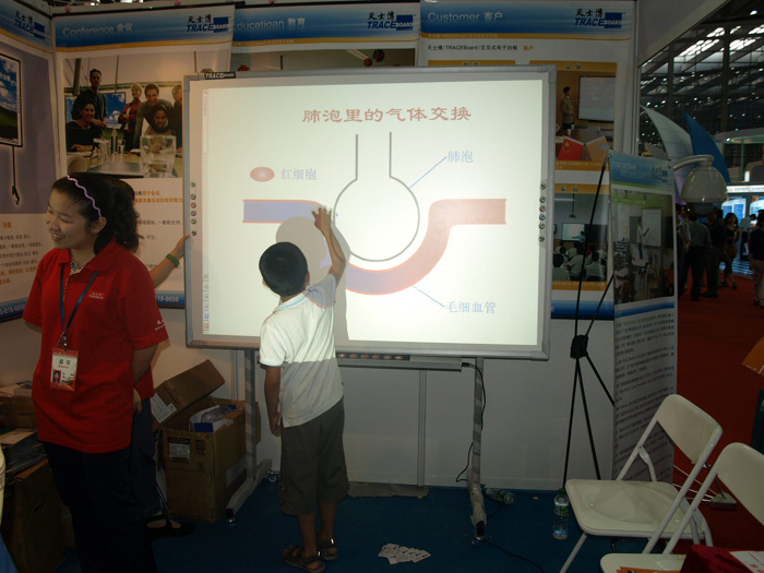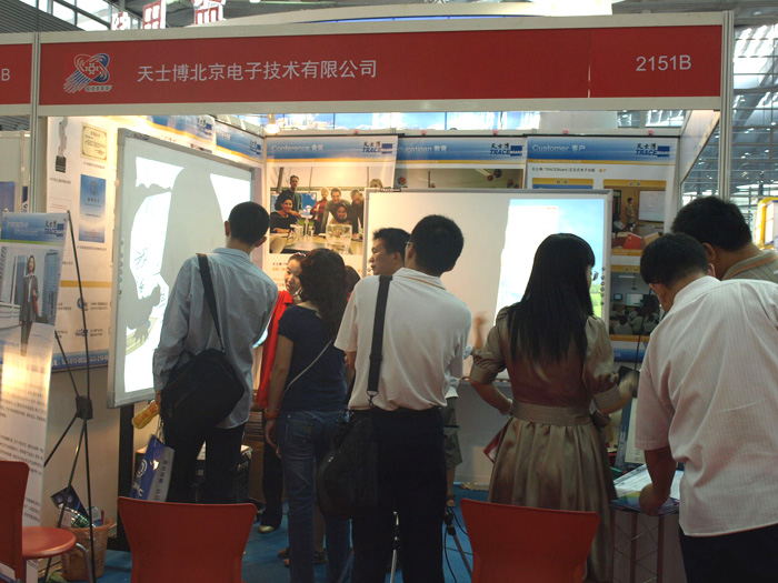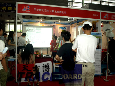在一號館天士博產品展區(qū),圍滿了想親自現(xiàn)場體驗天士博數(shù)碼互動白板TB-680的觀眾,體驗過的人,無論是老人,青年人,或是小孩,無不對此產品的神氣之處嘖嘖稱奇!