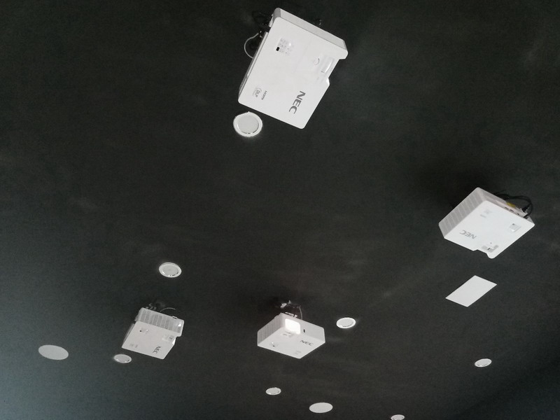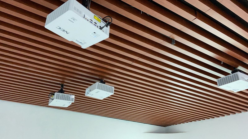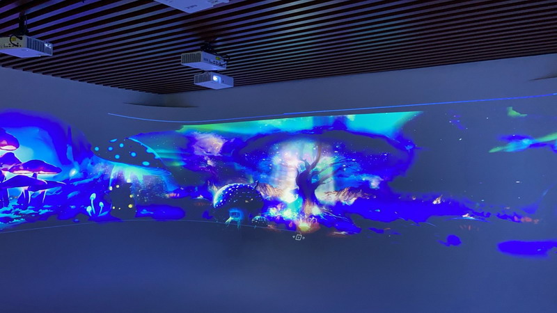 在長三角某數(shù)據(jù)應(yīng)用服務(wù)中心,三面墻體被4臺5000流明NEC CS5500HL短焦激光投影機(jī)打造的融合畫面鋪滿,其中,正面墻長9米,兩側(cè)墻長3.5米,三面墻的高均為2.2米,光影交融的U型畫面帶來縱深更強(qiáng)的場景空間。沉浸式投影畫面用于展示長三角區(qū)域?qū)m?xiàng)數(shù)據(jù)資源和應(yīng)用技術(shù)成果的同時(shí),還能夠令參觀者感到放松愉悅,專注于現(xiàn)有的場景之中。