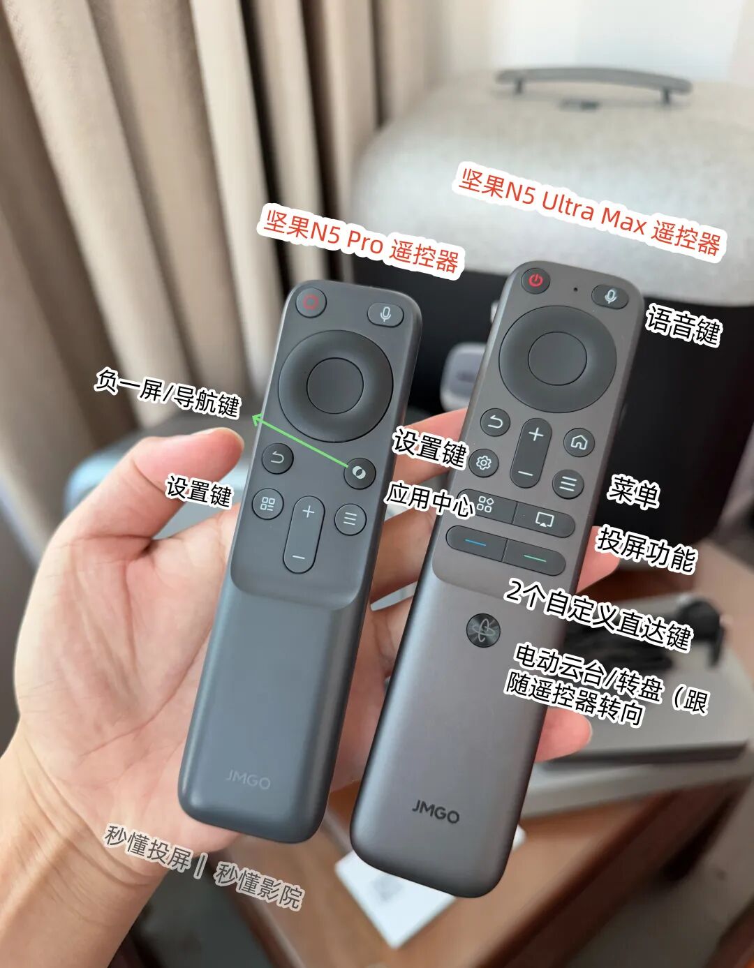 堅果N5 Pro和Pro Max的遙控器為短款,Ultra 和Ultra Max的為長款。新增有2個自定義應(yīng)用直達鍵,可以綁定你愛用的視頻軟件、直播軟件,開啟三方應(yīng)用會更快捷。新增有一個堅果投屏按鍵。另有一個電動云臺/轉(zhuǎn)盤按鍵,交互創(chuàng)新,按下后,