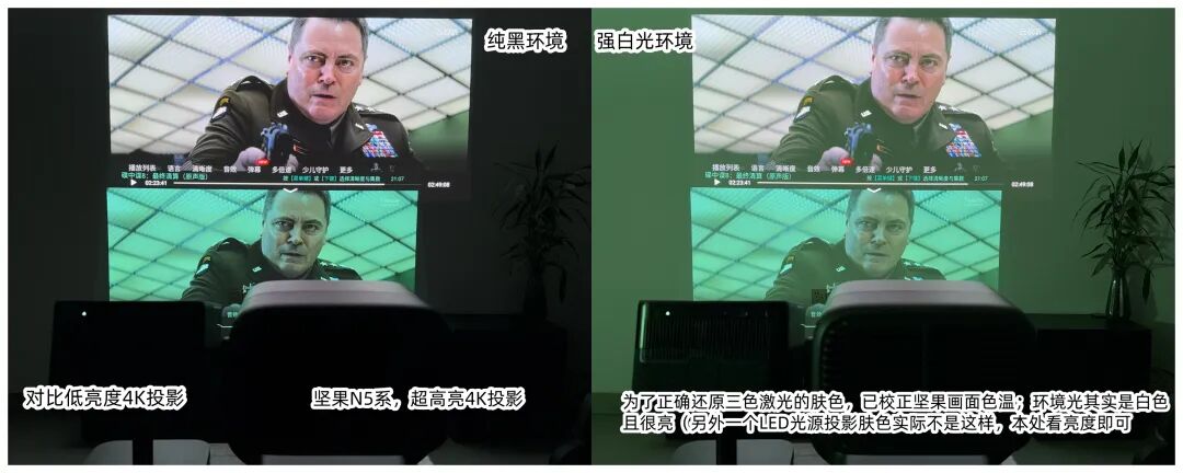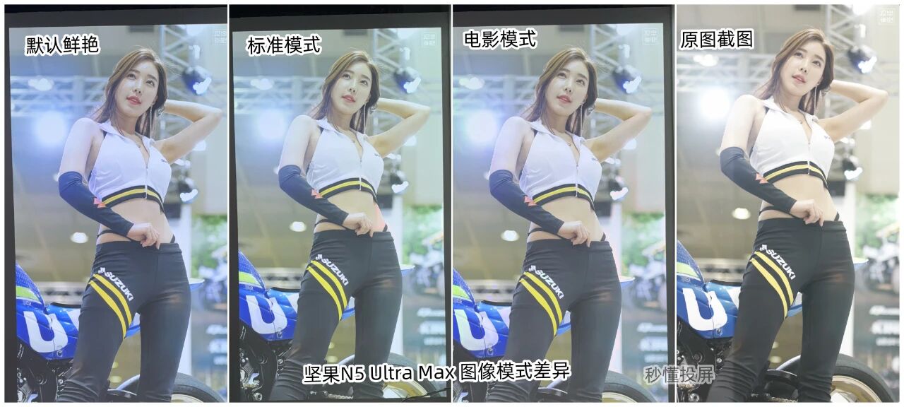 堅果N3 Pro系列我曾經(jīng)夸過,白平衡處理得不錯。堅果N5系列,采用CIE170-2:2015色準標準,把色準進一步提升至ΔE≈0.7。以下是堅果N5 Ultra Max和堅果N5 Pro屏攝實拍。電視劇用的是默認的鮮艷模式,電影用的是電影模式。兩臺投影圖像膚色都是還算舒適自然,圖像細膩,未見偏色,其中堅果N5 Ultra Max整體會更明亮,高光處更透亮。不同的圖像模式和原圖對比。鮮艷模式有新亮麗之感,視覺沖擊大。標準模式和電影模式則更偏D65標準色溫,和原圖最接近,追求色準選這2個。