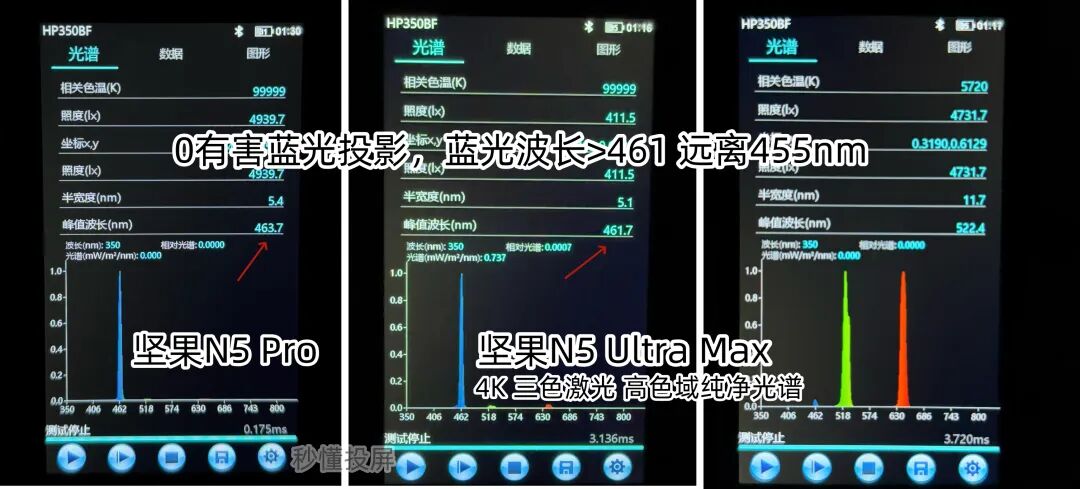 堅果N5還是0有害藍光投影,屬于硬件級0藍光。無需像多數(shù)顯示器、電視那樣要切換低藍光模式,無需忍受泛黃的低藍光畫面。如下圖堅果N5的藍色光譜高聳且波峰大于461nm,已經(jīng)遠離了420-450有害藍光波段。紅率光譜也是一樣高聳且窄,越窄代表色域越純凈和色域越高。這正是純?nèi)す馔队暗墓庾V無疑。