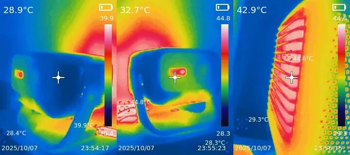 如下圖是堅果N5 Ultra Max的熱量圖。散熱口集中在背部,持續(xù)使用2小時背部外殼部分熱量約44.6度。兩側(cè)為進風(fēng)口和主攝像頭部分比較低溫。持續(xù)用2-3個小時也沒有出現(xiàn)風(fēng)扇加大和溫度爆增度情況,這個表現(xiàn)還是可以的。