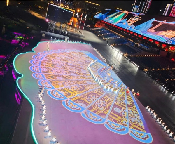大型中國舞組舞表演《錦繡之韻》是本屆開幕式的一大亮點,表演由“鼓、樂、詩、花”四個段落構(gòu)成,濃縮四川三千年文明,“鼓”寓意昂揚,“樂”寓意熱情,“詩”寓意溫雅,“花”寓意開放。太陽神鳥、說唱俑、二十四伎樂、川劇變臉等巴蜀文化符號在舞臺上煥發(fā)生命,與舞者、燈光、湖景融為一體,讓億萬觀眾為之動容。在這場戶外光影盛宴中,50臺巴可UDX系列投影機承擔了舞臺視覺呈現(xiàn)的重要任務(wù)。